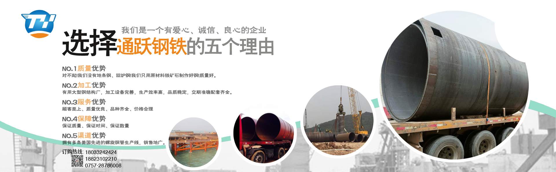佛山市通躍鋼鐵有限公司 電話180-2228-4448 0757-28786008 擁有多條美國先進的螺旋鋼管生產(chǎn)線,生產(chǎn)直徑φ159-φ3620mm(壁厚6mm-20mm)的雙面埋弧螺旋焊鋼管,年生產(chǎn)能力15萬噸。 生產(chǎn)螺旋管 螺旋鋼管 螺旋焊管 規(guī)格厚度6mm-20mm 直徑159mm-3620mm 有多條鋼板卷管機生產(chǎn)規(guī)格厚度6mm-70mm 直徑400mm-5020mm 螺旋管 螺旋鋼管 鋼護筒 焊接鋼護筒 鋼板卷管 丁字焊管 加工格構柱 鋼管樁 材質Q235B Q345B Q235A 45# 20# Q420D Q390··· ……